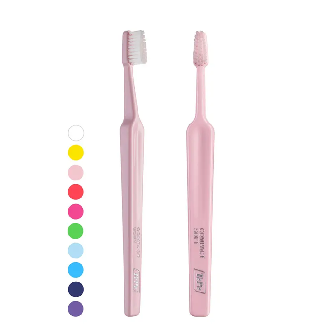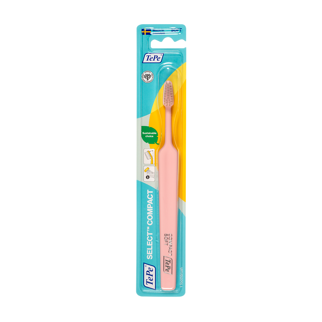 TePe Select Compact Orta Sert, yüksek kaliteli TePe Select serisinin daha küçük fırça başlığına sahip olan versiyonudur. Diş yüzeyindeki lekeleri ve plakları daha güçlü bir fırçalama hissiyle temizlemek isteyen, aynı zamanda küçük başlığın sunduğu hareket kabiliyetinden faydalanmak isteyen kullanıcılar için tasarlanmıştır.